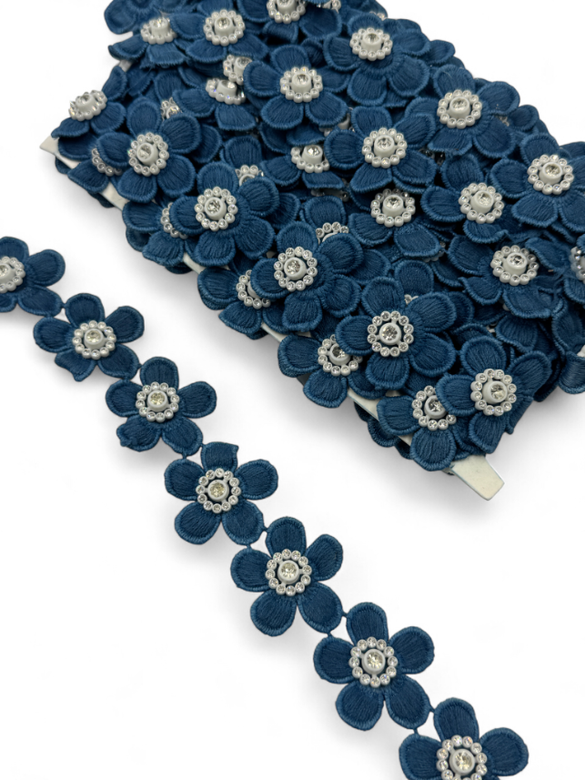Pasmanterie brodată cu flori delicate și strasuri aplicate în centrul fiecărei petale, ideală pentru decorarea ținutelor de ocazie și a accesoriilor vestimentare.